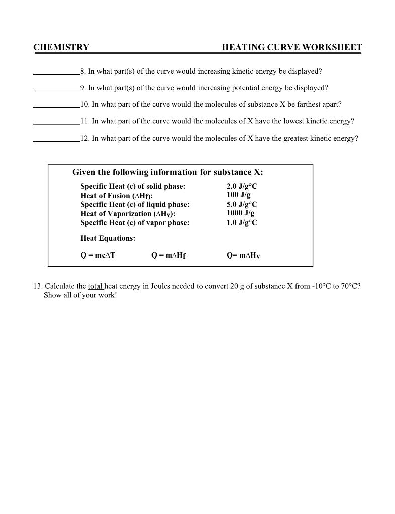 CHEMISTRY HEATING CURVE WORKSHEET If this curve is read from right to left, it is a Cooling Curve. The diagram below illustrates the steps involved to ... CHEMISTRY. HEATING CURVE WORKSHEET. Heating Curve for Water | Introduction to Chemistry ... Heating Curve of WaterThe phase transitions of water. Analysis of a Heating Curve Looking from left to right on the graph, there are five distinct parts to the heating curve: Solid ice is heated and the temperature increases until the normal freezing/melting point of zero degrees Celsius is reached. The amount of heat added, q, can be computed by: Cambridge IGCSE Chemistry Coursebook 4th Edition These results can then be used to produce a heating curve Figure 2.6 An electrical melting-point apparatus. (Figure 2.8, overleaf). Similar apparatus can be used to if the m.p. is below 20 °C and the b.p. is above 20 °C, the produce a heating curve but the thermometer must be substance will be a liquid at room temperature. placed in a test ... Chemistry Name - Heating Curve Worksheet – Energy - StudyLib Chemistry Heating Curve Worksheet – Energy 1) 2) 3) 4) 5) 6) 7) 8) 9) 10) 11) 12) Name: Date: What is happening to the average kinetic energy of the ...