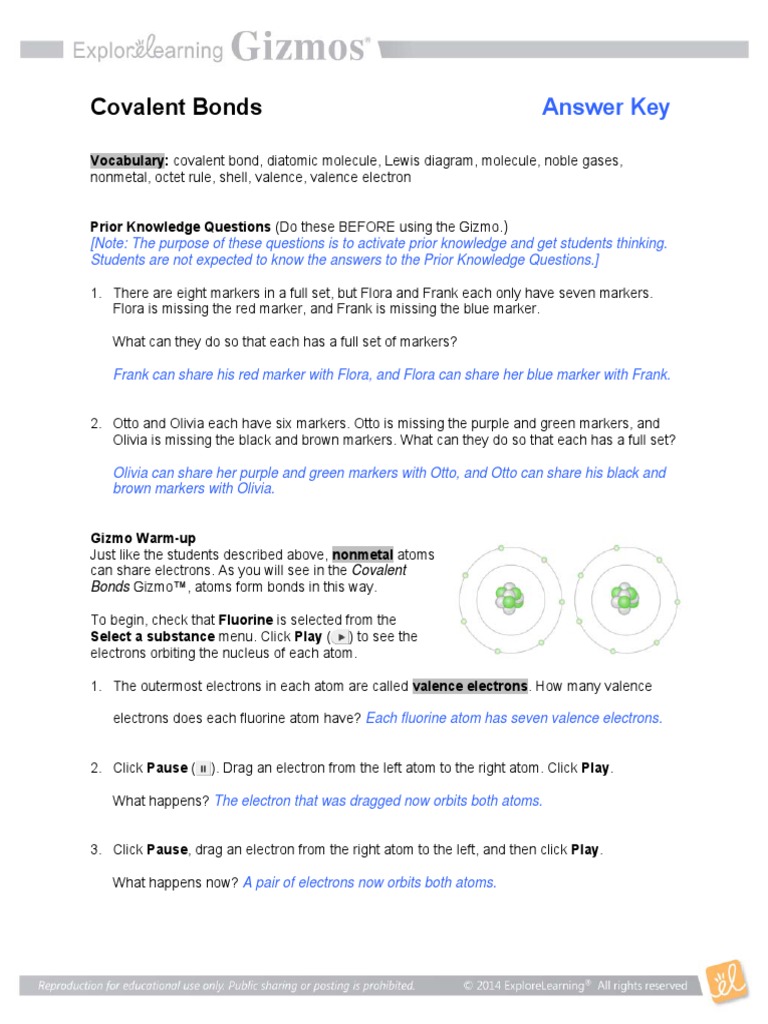 Atomic Structure Chemical Bonds Worksheet Answers Right here, we have countless books atomic structure chemical bonds worksheet answers and collections to check out. We additionally come up with the money for variant types and plus type of the books to browse. The gratifying book, fiction, history, novel, scientific research, as skillfully as various further sorts of books are readily ... Chemical bonding. 8th Grade Science Worksheets and Answer key, Study ... Chemical bonding Chemical bonding involves only an atom's outermost electrons. These electrons are called valence electrons and because they have more energy than other electrons, they tend to be found further away from the nucleus. Read More... Science Worksheets and Study Guides Eighth Grade. Chemical bonding Overview Chemical Bonds Worksheet Answer Key Pdf Qiyb.kleinegeheimpjes.nl › Student-explorationAmerican Express. Student exploration answer key. Erfgoedflehite.nl. Dec 30, 2021 · Carbon Cycle Gizmo 2021 - Student Exploration: Carbon LEARNING GIZMO ANSWER KEY CELL ENERGY CYCLE Gas laws exploration worksheet answer key Oct 16, 2021 · Hydrogen (H2) is an elemental gas that is made up of two or more of the same atoms. the Pyramids, The Marie ... ORISE Lesson Plan: Just Breathe: An Introduction to … write the formula with the molecules’ chemical formulas. Show the chemical equation of photosynthesis. CO 2 + H 2O O 2 + C 6H 12O 6 . Ask students to make connections between the two equations . Provide students with an analogy connecting the words to the chemical formulas with acronyms like ROYGBIV.