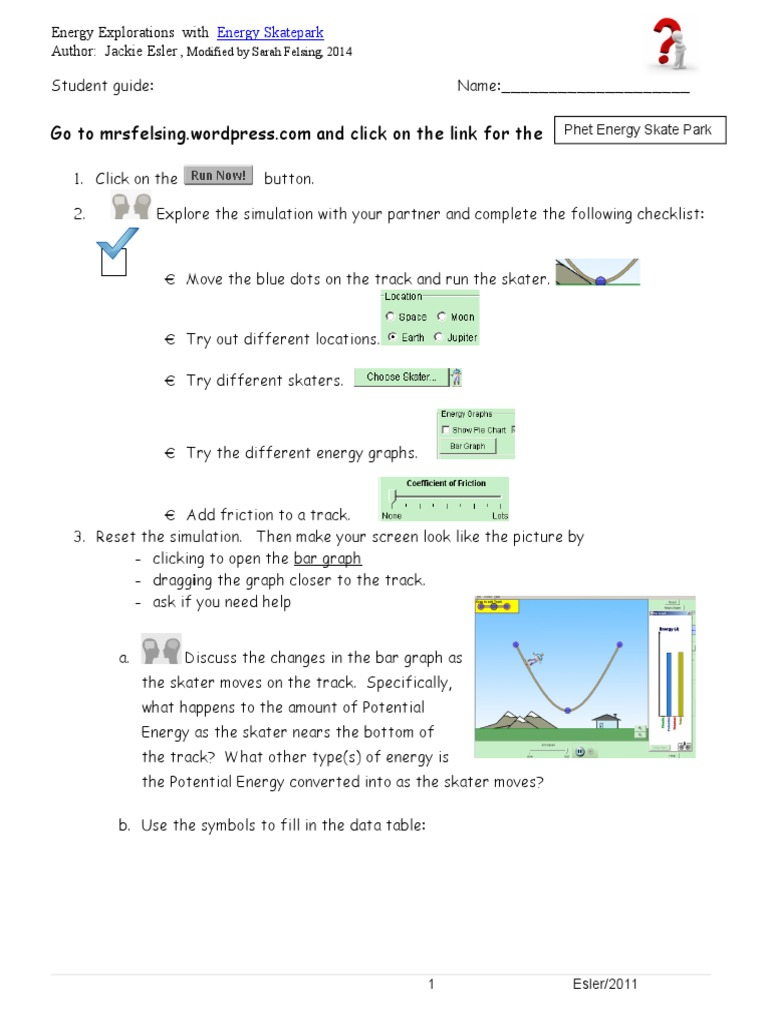 Energy Skate Park Worksheet.pdf - Name: _ Energy Transfer... Name: _____ Energy Transfer with and without Friction Prediction Time Go to and open Energy Skate Park. On the graph below, draw the expected potential, kinetic, and total energy of a skater going down a curved track, then back up the other side, with no friction. Show multiple (at least 3 cycles) Energy (J) Time With Friction - Now in an environment with friction, some of the energy is lost ... Phet Energy Skate Park Worksheet Answers - rezenith.com What can use a worksheet goes through different position of a force in slow motion does friction kinetic lab worksheet answers phet energy skate park phet energy skate up process of energy skate park basics clicker questions! We recommend using phet energy, and to use a role. Thank you, perhaps on whiteboards or chart paper, though the resource ...