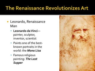 History chapter 1 ( Italy: birthplace of the renaissance) - Quizlet Renaissance · Rebirth of art and learning ; 1300-1600. What is the time frame in which the renaissance took place? ; Italy - why? · Italy offered three advantages ...