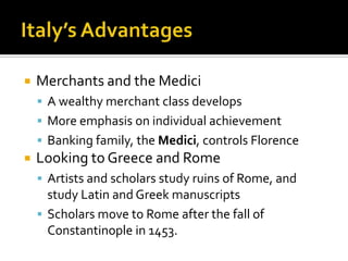 ITALY: BIRTHPLACE OF THE RENAISSANCE - Neshaminy School District Italy's Advantages—1300-1600 Renaissance: Rebirth of art & learning; starts in Italy and spreads North. (Rest of Europe recovering from 100 Yrs. War) Urban Centers Cities: Italy was urban, rest of Europe was rural; in cities people exchange new ideas. Economic changes: Plague hurt cities—fewer workers, survivors want higher wages. Chapter 17.1 italy, birthplace of the renaissance - SlideShare Italy Birthplace of the Renaissance Mr. Finnie The Renaissance tkester Ch 17 Renaissance Slides Eric Castro Summary of renaissance eeghe000 Ch13 Italian renaissance Walter Price Advertisement More Related Content Slideshows for you (20) The Renaissance Laurissa Agosta Renaissance Power Point janetdiederich The renaissance Complete Abdul Hafeez