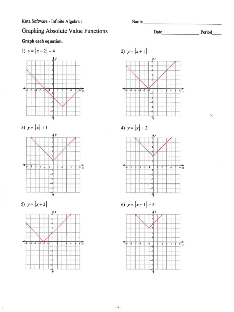 Graphing Absolute Value Functions Date Period - Kuta Software ©K 42U0X1G2C oKsutAa A ISto8f Etvw 8a pr nee LfL CC.H p QA3lElO 2rYiNg9het Psg irpe xs DeVryvhe Id c.y k 2M 0a Wd5el 9wPiwthr kI jn cfMiHnIi qt meU yA3lwgDejb krRa Z U10.9 Worksheet by Kuta Software LLC Kuta Software - Infinite Algebra 1 Name_____ Graphing Absolute Value Functions Date_____ Period____ › absolute-value-equationsAbsolute value equations - Math Worksheet Graphing absolute value equations Percents Percent of change Markup, discount, and tax Polynomials Adding and subtracting Dividing Multiplying Naming Quadratic Functions Completing the square by finding the constant Graphing Solving equations by completing the square Solving equations by factoring Solving equations by taking square roots
