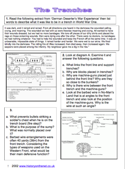 World War One Worksheets - History VerkkoA crossword with clues related to the structure and layout of trenches. Trench Wordsearch A wordsearch of key words related to the structure and layout of trenches. Life in the Trenches A worksheet explaining what life was like in the trenches. World War One Weapons An illustrated information sheet about the types of weapons used …