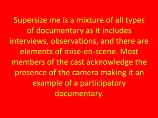Supersize Me! Documentary Worksheet ANSWERS - ESL worksheet by csuchy Supersize Me! Documentary Worksheet ANSWERS Supersize Me worksheets: Supersize me! Documentary Worksheet Level: advanced Age: 14-17 Downloads: 300 Supersize Me Part One (vocab and intro) Level: intermediate Age: 11-17 Downloads: 221 Supersize me Level: advanced Age: 14-17 Downloads: 97 Supersize me Level: intermediate Age: 12-17 Downloads: 93