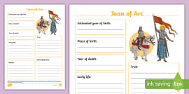 Joan of Arc for Kids - Activity Village Joan of Arc Worksheet Here's one of our fun fact-finding worksheets for Joan of Arc. You can print it out in colour or black and white. Joan Of Arc Writing Page Our Joan of Arc writing page is perfect for children to record their own research. What have they found about this famous woman, also known as The Maid of Orléans? Joan of Arc's Diary