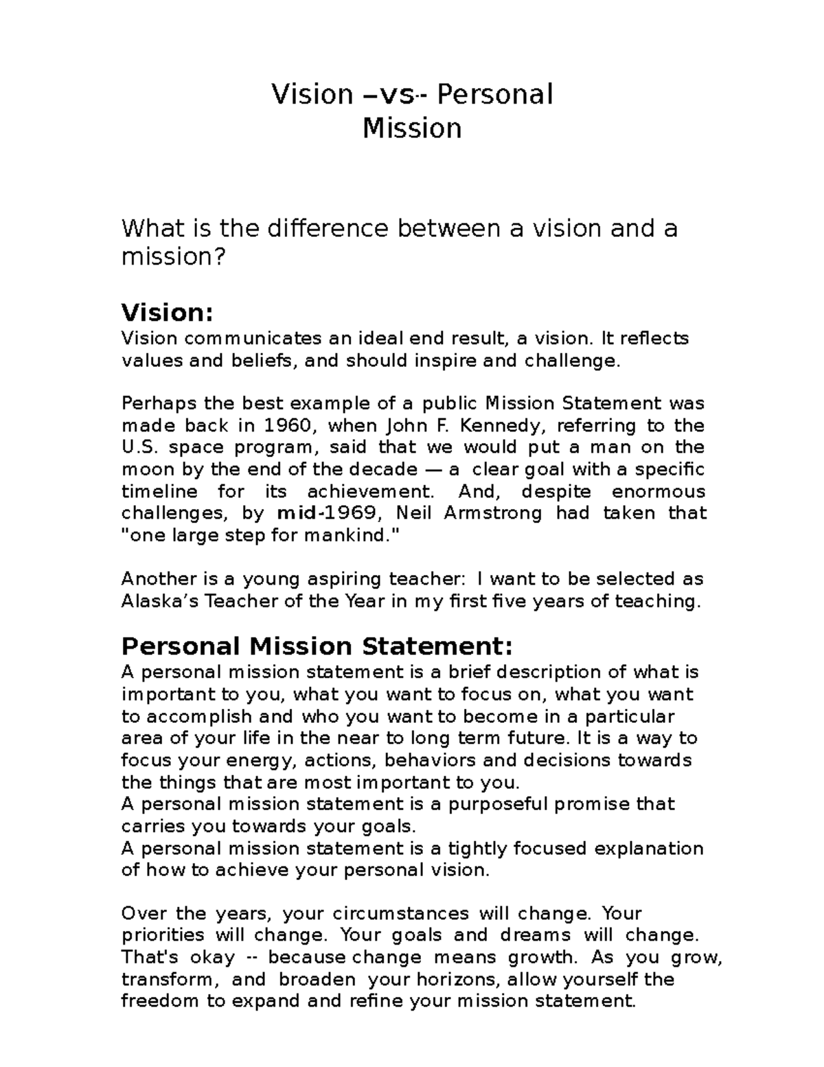 11+ Personal Mission Statement Templates in PDF | DOC A personal mission statement is generally used to articulate your values, your choices and who you are, ... Personal Mission Statement Worksheet Sample. How to Write a Personal Mission Statement + Worksheets How to Write a Personal Mission Statement + Worksheets. Sep 02, 2019. We're already two weeks into the New Year. We've set our goals, have big dreams and ... Personal Mission Statement Template Aug 17, 2017 ... A personal mission statement is a tightly focused explanation of how to achieve your personal vision. Over the years, your circumstances will ...
