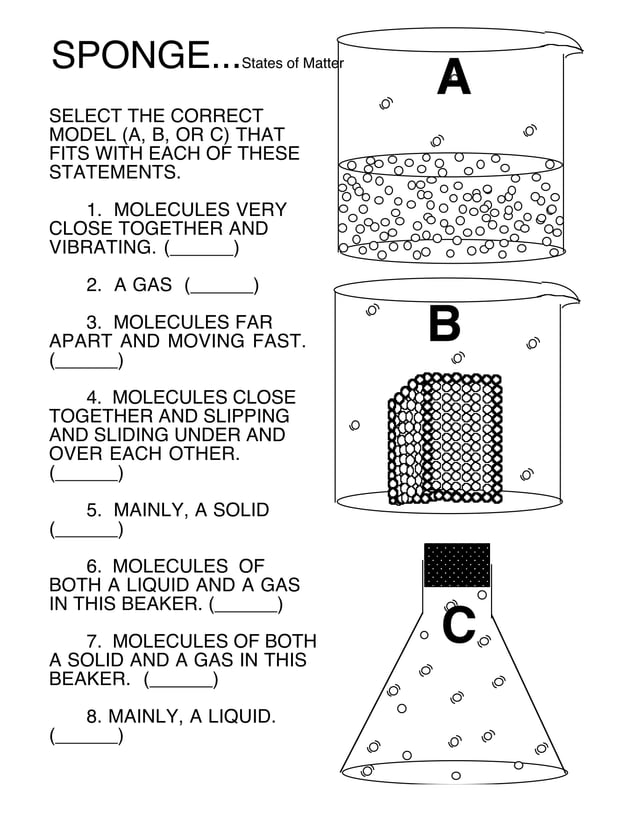3 States of Matter for Kids (Solid, Liquid, Gas): Science for … - Help support more content like this!Matter is all around us! Solid, liquid, and gas, everything you see, touch, and even bre... States of matter worksheets and online exercises Live worksheets > English > Natural Science > States of matter. States of matter worksheets and online exercises. Language: English Subject: Natural Science. Order results: States of matter and their properties. Grade/level: 4th grade. by mariaignaciasilva. Changes of state. Grade/level: Grade 3. States of Matter Worksheets | K5 Learning States of matter worksheets - students examine the concept that matter can exist in solid, liquid or gas form. Free | Printable | Grade 2 | Science | Worksheets ... These worksheets examine the concept that matter can exist in solid, liquid or gas form. Water is the easiest example to illustrate this (ice, water, steam). It's also a chance to ... States of matter worksheet: - DewWool States of matter identification worksheet Answer to the above image-based worksheet: 1) Gas, 2) Solid, 3) Liquid, 4) Solid, 5) Solid, 6) Solid. Solid, liquid, and Gases worksheet: Answers to the above worksheet are: Question 1) a) Alcohol, b) Atom c) Water Vapour. Question 2) a) Evaporation, b) Precipitation