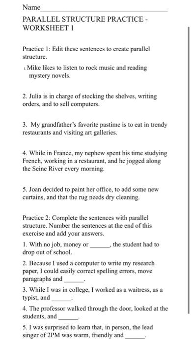 PDF PARALLEL STRUCTURE PRACTICE - WORKSHEET 1 - eslwriting.org PARALLEL STRUCTURE PRACTICE - WORKSHEET 1 . Practice 1: Edit these sentences to create parallel structure. 1. Mike likes to listen to rock music and reading mystery novels. 2. Julia is in charge of stocking the shelves, writing orders, and to sell computers. 3. My grandfather's favorite pastime is to eat in trendy restaurants and visiting art Exercise on Parallel Structure with Explanation | Learn English Exercise on Parallel Structure with Explanation 1. I want this to be done ___ 2. His actions were - 3. She was - 4. Doctor advised him - 5. My wife is ___ 6. I asked him to finish reading the book ___ 7. The protest was - 8. I know you can complete the task - 9. Don't leave me here - 10. While visiting New York we - 11. She likes - 12. Parallel Structure Quiz: Test yourself on Parallelism - Grammar Wiz Parallel Structure Quiz. Decide whether the sentence has parallel structure or not. 1. She decided to leave her job and travelling the world. 2. He started the engine, released the hand break, and checked the mirror. 3. Some people think that being successful is the same thing as to have money. 4. PDF Parallel Structure - Exercise 1 - Weebly Determine whether the sentences below contain errors in parallel structure. Fix any problems that you find. 1. Pancakes dripping with syrup, coffee steaming in big mugs, and bacon frying on the stove make breakfast at Grandma's house a real treat. 2. Le'Ron scowled at Professor Nguyen, was muttering under his breath, and sighed heavily, but in