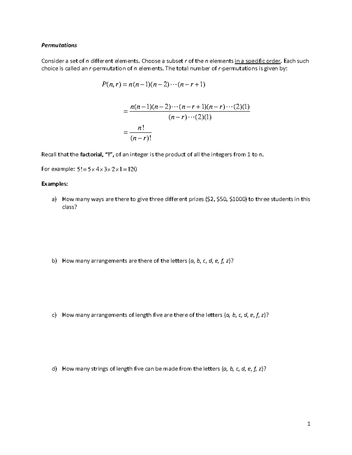 Acc Math I Permutations And Combinations Answers Acc Math 1 Permutations And Combinations Answer Worksheet ... Acc Math I Permutations And Combinations Worksheet Answers There are five problems in each worksheet Number of Permutations 12 7P 3 2 7 Title Math 1 Permutation Practice Worksheet 1 28 2011 Author Karen Cheney Last modified by Sarah Recht Created Date 10 1 2 / 14. 2014 4 33 00 PM nP0 ...