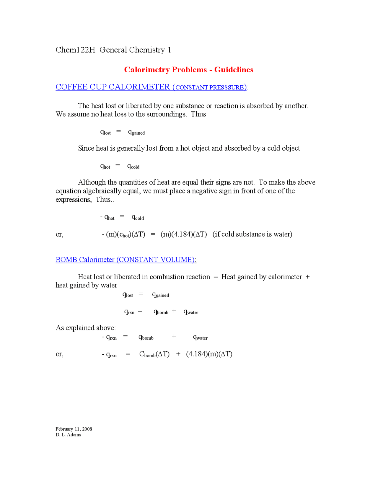 PDF Calorimetry Practice Worksheet (Section 17.2) - NOTAPROTON Calorimetry Practice Worksheet (Section 17.2) 1.) Compound A is burned in a bomb calorimeter that contains 2.50 liters of water. If the combustion of 0.175 moles of this compound causes the temperature of the water to rise 45.00C, what is the molar heat of combustion of compound A (in kJ/mole)? The heat capacity of water is 4.18 J/g 0C. ∆H = -q