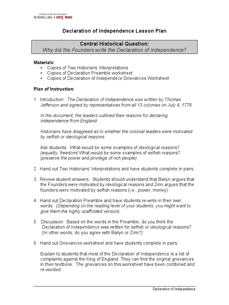 8th Grade Declaration of Independence Grievances Worksheet ... May 16, 2022 · Declaration of independence worksheet answer key february 24 february 22 worksheet by victoria a writing style guide is a significant resource when seeking to emulate a specific style but it can be near impossible for a style guide to cover whatever you might want. There are a total of twenty-eight Some possible answers include that the King. Analyzing the declaration of independence worksheet answers 15.02.2022 · Analysis of the declaration of independence worksheet answer key. On the rights of women 25 years after the Beijing Declaration on Women We still have a long way to go By M. Practice a variety of subjects with tests from College Board and Ivy Global. sang the national anthem before his “I Have a Dream” speech and then quoted the Declaration of … The Declaration of Independence: "An Expression of the American Mind ... This lesson plan looks at the major ideas in the Declaration of Independence, their origins, the Americans' key grievances against the King and Parliament, their assertion of sovereignty, and the Declaration's process of revision. Upon completion of the lesson, students will be familiar with the document's origins, and the influences that ...
