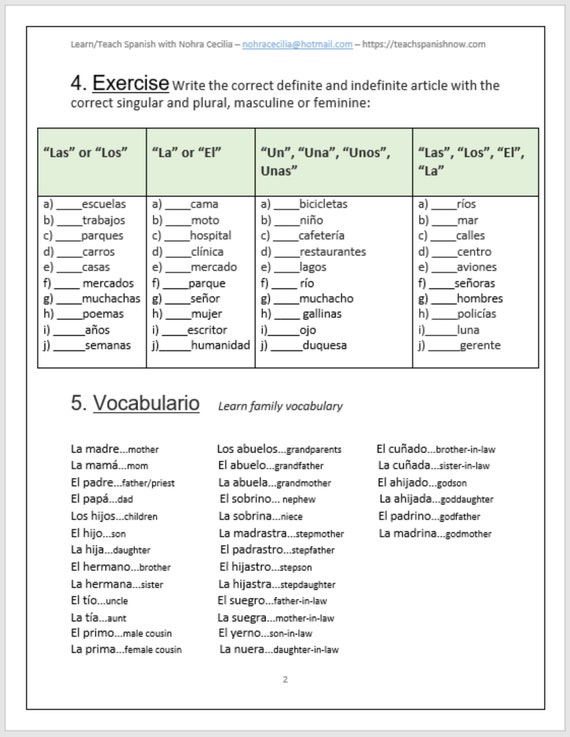Spanish 1 Worksheets - Definite and Indefinite Articles in Spanish Worksheet - Fill the gap - (1 page) Complete with the correct definite and indefinite articles. The same noun is repeated four times in order to practice the definite/indefinite version and the singular/plural form. 3. Worksheet - Give Examples - (1 page) Give examples of each type of article. 4. Worksheet - Identify article - (1 page)