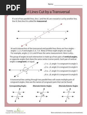 Parallel Lines Cut By A Transversal Worksheet Pdf Free parallel lines cut by a transversal printable math worksheets for 4th grade students. First, Students Will Need To Be Able To Identify Angle Pairs, Then Know The Properties And. Algebra to find unknown variable. 1/1/2007 7:39:56 pm document presentation format Explain to the class they will be working on a project involving parallel lines ...