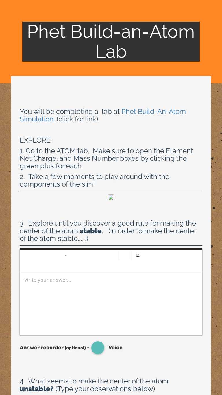 pHET Build an Atom Google Worksheet .docx - Phet Build an... Phet Build an Atom Google Worksheet NAME: Open "Phet: Build an Atom" under Day 1, Module 2.. Click atom at the bottom of the phet screen. The Element button should be orange, click Net Charge and Mass Number to make them orange also. Orbits should be clicked. You can hold and drag protons, neutrons and electrons into your atom.