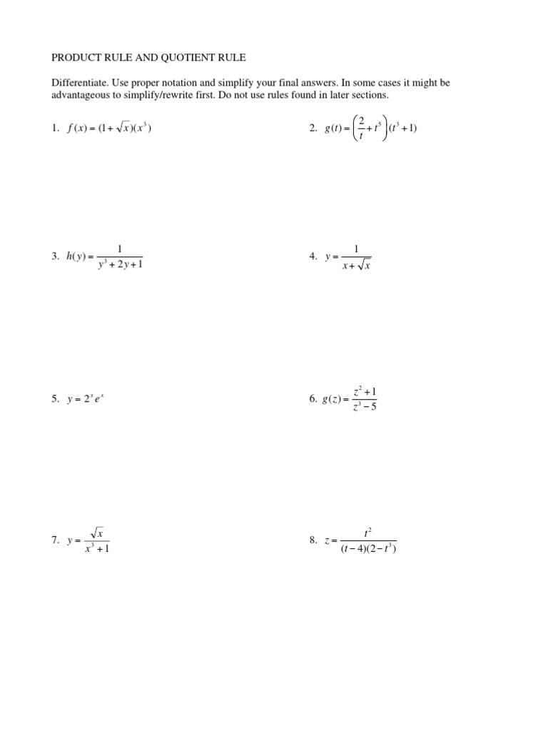 Product and quotient rule worksheet