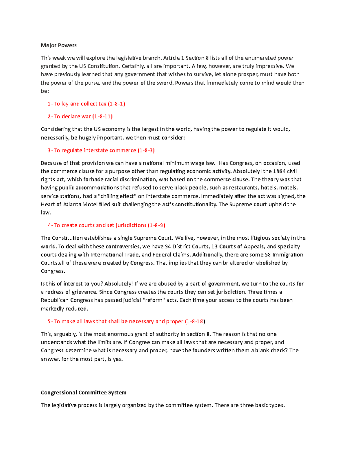 PDF P a g e | 1 WORKSHEET: THE LEGISLATIVE BRANCH - Pueblo County School ... Powers of Congress - Congress has legislative and nonlegislative powers. 1. Legislative powers—power to make laws expressed powers—powers specifically granted to Congress, mostly found in Article I, Section 8 of the Constitution implied powers—powers that may be reasonably suggested to carry out the expressed powers; found in