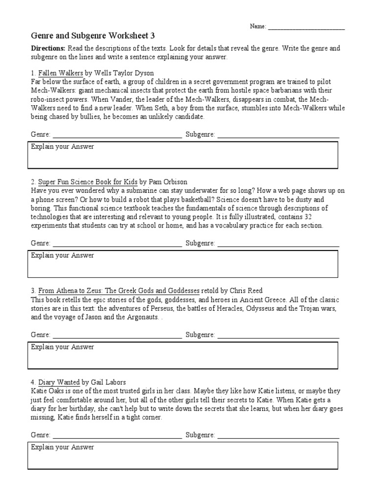Genre Worksheets | Ereading Worksheets Here is another genre and subgenre worksheet. This one is a little bit easier than some of the other genre worksheets on this page. It's great genre practice for younger students. Students read the short texts, identify the genre and subgenre, and explain their answers. This worksheet has 17 problems! Suggested reading level for this text ... genre-assignment.docx - Name: _Heaven Thomas_ Genre and Subgenre ... View genre-assignment.docx from ECON 212 at Trinity Washington University. Name: _Heaven Thomas_ Genre and Subgenre Worksheet 6 Directions: Read the descriptions of the texts. Look for details that