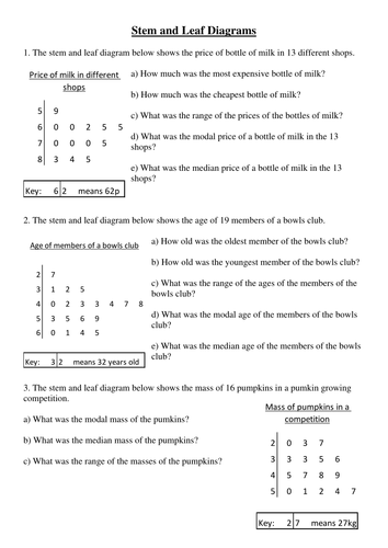 Stem and Leaf Diagrams Textbook Exercise - Corbettmaths Stem and Leaf Diagrams Textbook Exercise - Corbettmaths. September 26, 2019 corbettmaths. Stem and Leaf Plot Worksheets - Tutoringhour.com Navigate through our printable stem-and-leaf plots worksheets to become skilled in analyzing, interpreting, and organizing data on plots. The stem-and-leaf plots provide students a quick review of data distribution, thereby facilitating faster computation of the mean, median, mode, and range of a collection of data. Stem Leaf Plots Worksheets - Printable Worksheets Stem Leaf Plots Showing top 8 worksheets in the category - Stem Leaf Plots. Some of the worksheets displayed are 3 7 key 6 5, Stem and leaf plots examples, Stem and leaf plots, Stem and leaf plots, Work to accompany the stem and leaf plots lesson, Back to back plot 1, Math mammoth statistics work, Visualizing data date period.