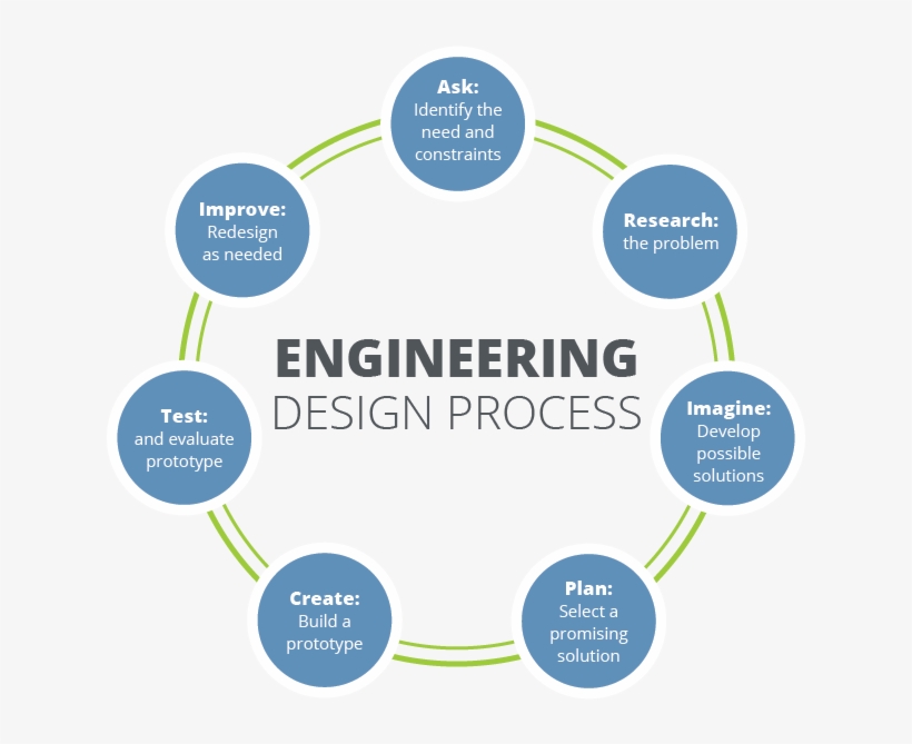 The Complete Guide - Engineering Design Process For Kids The Steps of the Engineering Design Process 1. Ask - Identify the problem we are trying to solve. 2. Research - Use every resource available and take notes. 3. Imagine - Brainstorm as many ideas as possible. 4. Plan - Decide on and design solution. 5. Create - Build out or implement the solution. 6. Test - Test the solution and have others test it.