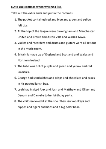 Using commas for list worksheet - Liveworksheets.com ID: 2859068 Language: English School subject: English Language Arts (ELA) Grade/level: std 3 Age: 6-12 Main content: Commas Other contents: comma for lists, punctuation Add to my workbooks (43) Download file pdf Add to Google Classroom Add to Microsoft Teams Comma practice worksheets | K5 Learning We use commas to set of introductory words and clauses, to separate items in a list, in compound sentences, in dates, with quotation marks and in various other instances. These worksheets provide students with further practice using commas. Worksheet #1 Worksheet #2 Worksheet #3 Similar: Apostrophes and possession Contractions worksheets