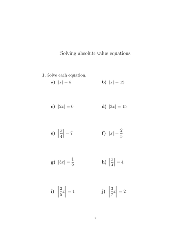 Absolute value equations - Math Worksheet When faced with an absolute value equation, we need to correctly utilize the definition of absolute value. Definition: Let \(x\) be some variable or algebraic expression. Then ... Solve each equation. This free worksheet contains 10 assignments each with 24 questions with answers.