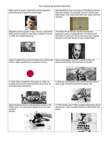 Causes of World War Two: History Worksheet - History A three-page information sheet giving details of the main causes of World War Two – Versailles, Hitler’s Actions, Appeasement, League of Nations. Need more history worksheets? Click here to see our collection of 500 free history worksheets. Loading... Cite This Article "Causes of World War Two: History Worksheet" History on the Net
