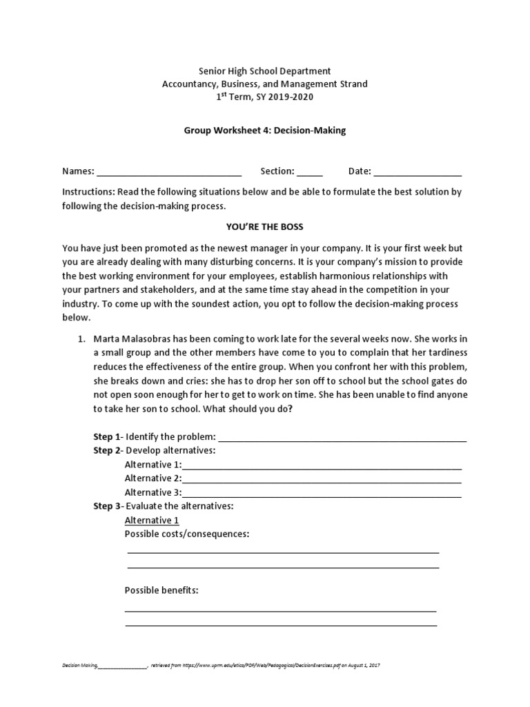 Group decision making worksheet. Exchange Team Blog - Microsoft Community Hub Dec 05, 2022 · You Had Me at EHLO.. Great customer had to refrain from using this just weeks ago as RecipientWritescope and limiting the cmdlets/Parameters was not possible until now."The role assigned to application cd336608-5f8b-4360-a9b6-2b6374a9dc75 isn't supported in this scenario. Teaching Tools | Resources for Teachers from Scholastic Teachers Teaching Tools Homepage. Items in this cart only reflect products added from the Teacher store.-+ 1040 (2021) | Internal Revenue Service - IRS tax forms Form 1040 and 1040-SR Helpful Hints. Form 1040 and 1040-SR Helpful Hints. For 2021, you will use Form 1040 or, if you were born before January 2, 1957, you have the option to use Form 1040-SR. Medical Decision Making And The Marshfield Clinic Scoring ... Two thought processes receive credit for old records and/or obtaining a history from someone other than the patient. The first is the decision that additional information is needed. That decision is scored with 1 point. The second part of the process is reviewing information obtained and using it in the decision making process.