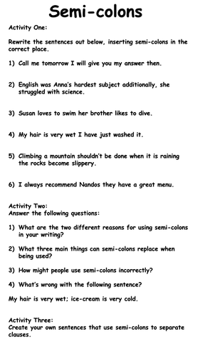englishforeveryone.org › PDFs › SemicolonsSemicolons - EnglishForEveryone.org Semicolons The semicolon has three primary functions: 1) To combine two closely related complete sentences (independent clauses) which are not joined by a conjunction. 2) To separate complete sentences (independent clauses) that are joined by a conjunctive adverb. 3) To separate items in a list when commas alone would be confusing. › resource › colons-and-semicolonsColons and Semicolons Worksheet - Using Semi-Colons ... - Twinkl This differentiated colons and semicolons worksheet helps children to practise using semi-colons, colons and dashes in different types of sentences. They identify where the different punctuation should be used in given sentences and have a go at writing their own sentences using semi-colons, colons and dashes too. › category › englishYear 6 English Worksheets | English Worksheets With Answers Understand the Use of a Dash for Joining Sentences TRY WORKSHEET FOR FREE. Understand the Correct Use of the Dash TRY WORKSHEET FOR FREE. Use Bullet Points Correctly TRY WORKSHEET FOR FREE. Use Colons Correctly: Adding Further Information TRY WORKSHEET FOR FREE. View all 11 worksheets