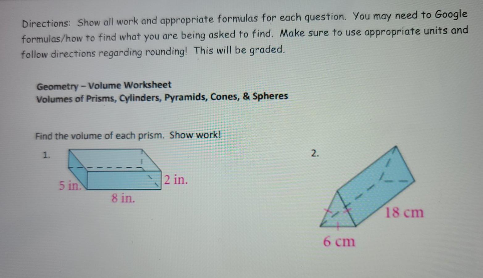 Volume Of Prisms Cylinders Cones And Pyramids - Printable Worksheets Showing top 8 worksheets in the category - Volume Of Prisms Cylinders Cones And Pyramids. Some of the worksheets displayed are Volume of spheres cones cylinders and pyramids work, Volume of prisms cones pyramids spheres h, Volume of pyramids and cones, Volume of cones and pyramids, Volume of cylinders and cones work, Name date per, 10 volume of prisms and cylinders, Volume. volume of prisms, cylinders, cones, and pyramids - TeachersPayTeachers volume of solids worksheet pages 1-2: solids include: prisms, cylinders, cones, pyramids and spheres; 12 problems total pages 3-4: answer keya nice worksheet that can be used for in class review, as homework, or an assessment.surface area and volume bundle note: this resource has been opted-in for the tpt digital easel tool for teachers to create …