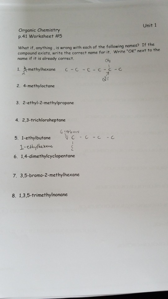 Solved Unit 1 Organic Chemistry p.41 Worksheet #5 hat if - Chegg Transcribed image text: Unit 1 Organic Chemistry p.41 Worksheet #5 hat if, anything, is wrong with each of the following names? If the compound exists, ...